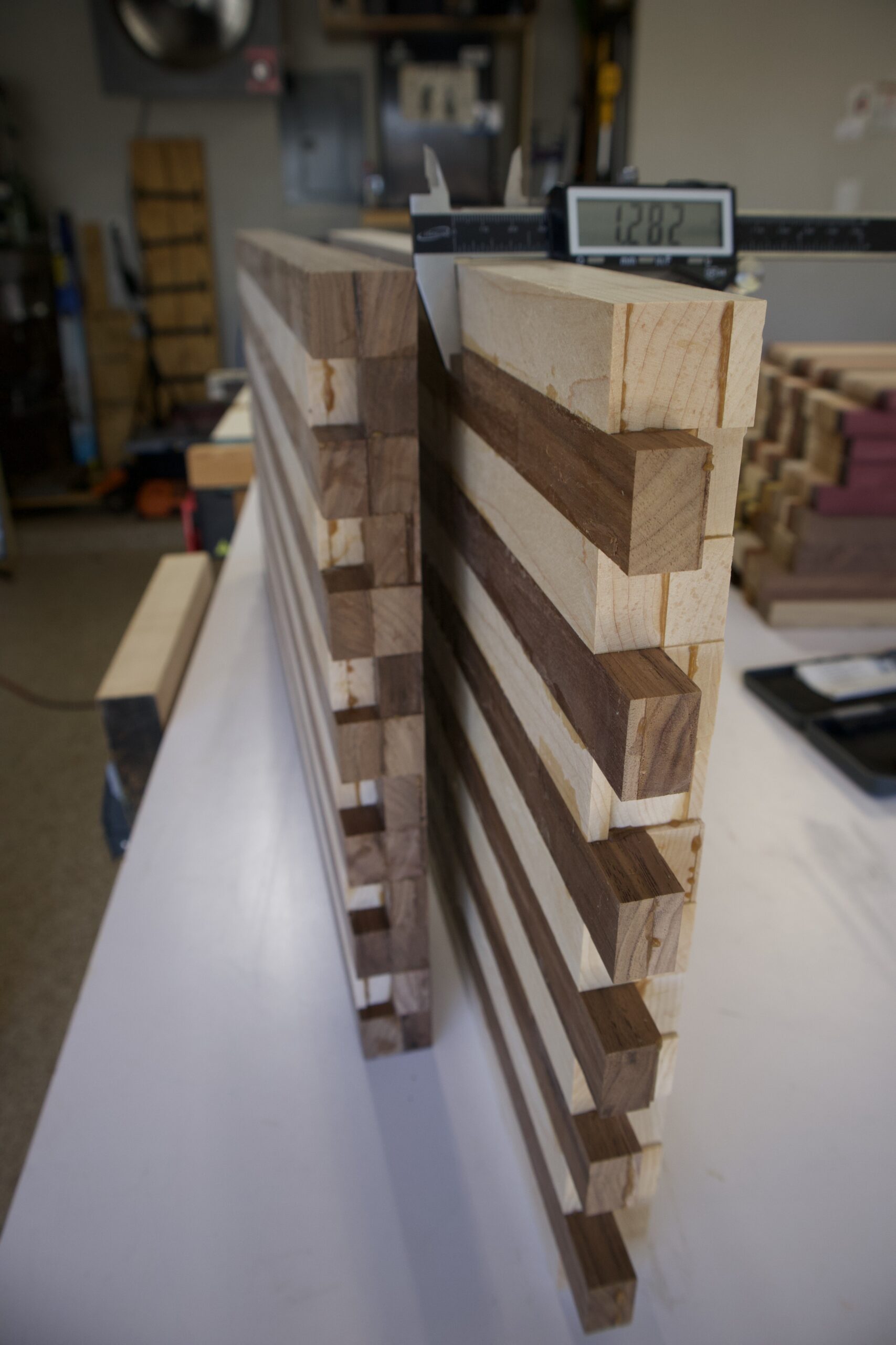 Next I made solid hard maple and black walnut panels then ripped 1+" strips and planed their width down to 1".